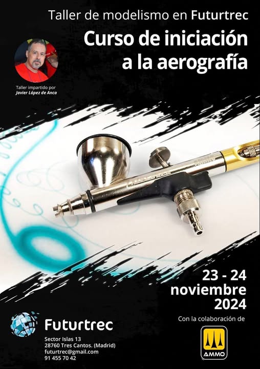 El 23 y 24 de noviembre realizaremos un curso de Aerografía de Iniciación, donde enseñaremos el mantenimiento del aerógrafo, cómo pintar con él aplicando diferentes pinturas, barnices.... Y veremos conceptos de aplicación de materiales y pinturas de 'Weathering' para conseguir efectos de envejecimiento y reproducción veraz del contexto histórico en la maqueta...
